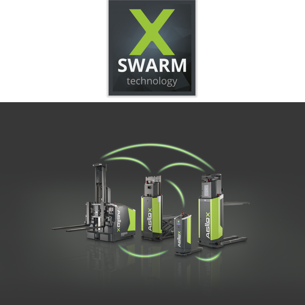 All AGILOX AMRs communicate and exchange information about their position and status. The AMRs use X-SWARM technology to dynamically decide which vehicle takes on which task. This solution enables communication and interaction between the AMRs for swarm intelligence. If one robot fails, the others take over to maintain the flow of goods. The AMRs recognize obstacles autonomously and take evasive action to ensure an uninterrupted material flow supply.