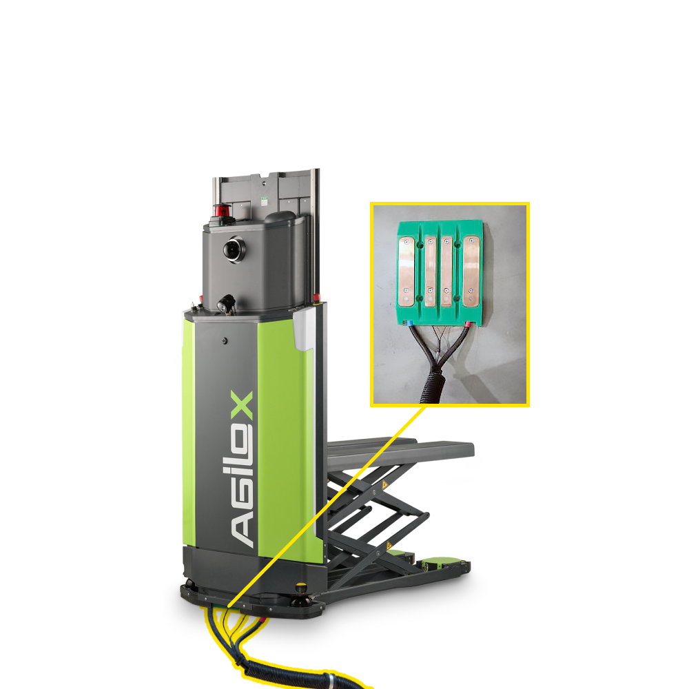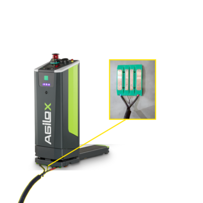 Batteries are automatically charged by driving to a charging station. The vehicle is charged via a charging plate on the floor and corresponding charging contacts on the underside of the vehicle. One charging station per AGILOX vehicle is required.